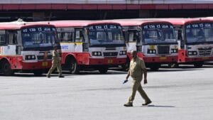 A file photo of KSRTC buses seen at the Majestic bus stand, in Bengaluru. | Photo Credit: MURALI KUMAR K Employees of the state-run Road …
