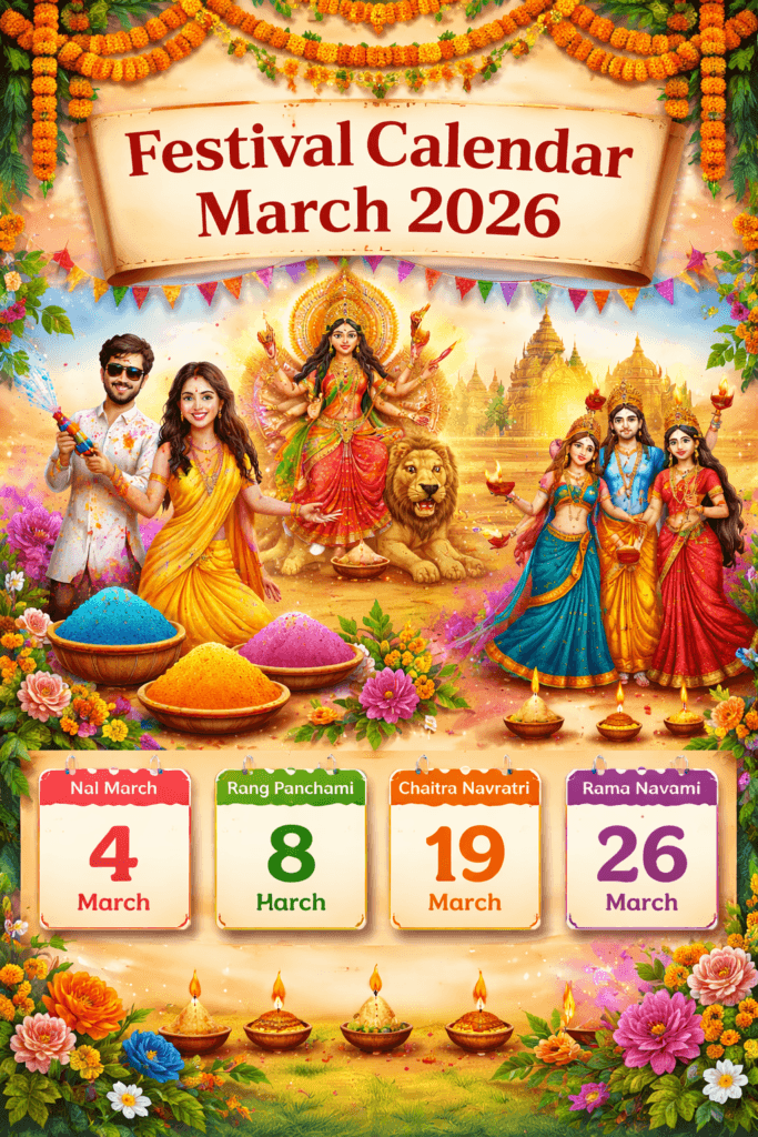 March 2026 brings several important Hindu festivals including Holi, Rang Panchami, Chaitra Navratri, and Rama Navami. This Holi Navratri Rama Navami festival calendar March 2026 guide explains the important festival dates, cultural traditions, and celebrations observed across India.